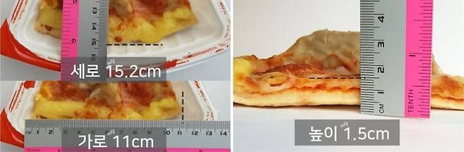 저는 너무 과격하게 뜯어서 이렇게 지저분하게 뜯겨 버렸는데요. 여러분은 조심조심 벗겨서 꼭 한 번에 성공하시길 바랄게요. 케이스 속에 있는 피자는 당연히 케이스보다는 작아요. 세로라고 해야 할지 반지름이라고 해야 할지 고민이 들었는데 조각피자로 나온 상품이니 세로라고 할게요! 세로는 15.2cm 가로는 11cm에요. 그리고 피자 도우와 위에 덮인 치즈까지를 높이로 하면 1.5cm 정도가 높이로 볼 수 있어요.