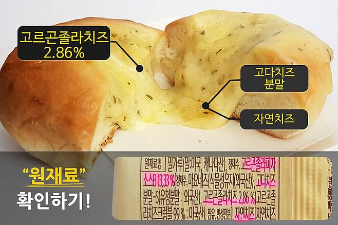 치즈반 빵반이라고 할 수 있을 정로 치즈 토핑이 만족스러운데요. 원재료를 살펴보니 고르곤졸라 피자 소스가 13.33% 들어있어요. 이 안에 고다치즈와 고르곤졸라치즈 2.86%, 자연치즈, 델리치후레시 등 다양한 치즈로 이루어져 있어요.