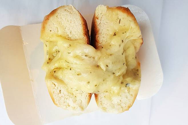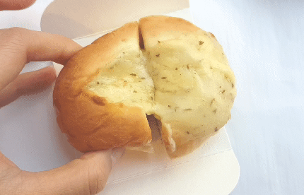 50초를 데웠을 뿐인데 용암처럼 펄펄 끓고 있는 치즈가 사랑스러웠어요. 반을 잘라보니 동그란 빵 안에는 깊숙이 치즈로 채워져 있는데요. 파슬리가루가 뿌려진 고른곤치즈의 고소함과 쫄깃함이 입안에 가득 채워지는 걸 느낄 수 있어요. 게다가 빵도 촉촉하고 부드러워서 목 넘김도 좋아요.