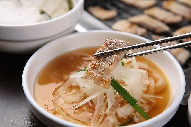 삼겹살과 냉면의 관계가 무엇이냐 묻는다면 단 한마디로 정의된다. 없어서는 안 될 사이다. 서로 사랑하는 연인 관계처럼 삼겹살을 품 속에 돌돌 말아 감은 냉면의 모습은 더할 나위 없이 든든하다. 냉면은 소위 물냉파와 비냉파로 나뉘는데, 두 메뉴 모두 두터운 팬층을 보유하고 있기 때문에 모두 인기가 좋다. 이와 비슷한 조합으로 비빔면과 삼겹살의 조합도 유명한데, 한번 맛보면 절대 헤어 나올 수 없는 맛에 매료되고 만다.