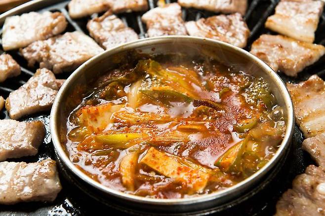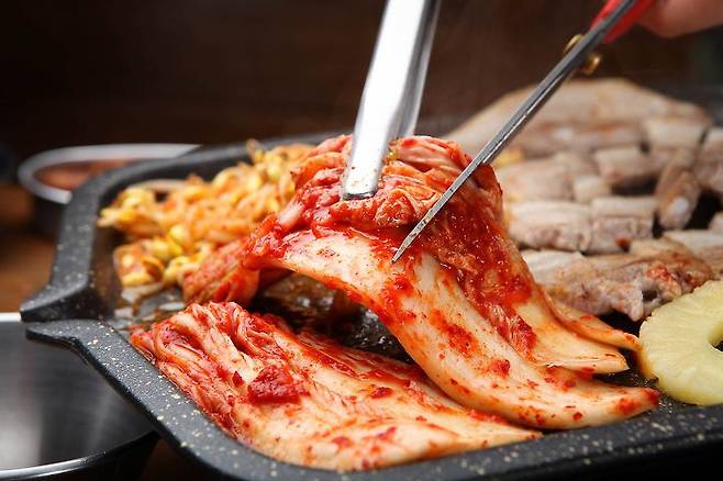 김치는 삼겹살 못지않게 불판 위에서 중요한 역할을 한다. 삼겹살과 김치를 불판에 올린 순간 사람들의 관심이 집중되는 가운데, 한 사람은 고기 굽기 다른 한 사람은 김치 굽기에 집중한다. 고기 굽기 정도만큼이나 김치의 굽기 정도가 중요한데, 살짝 주황빛이 돌며 가장자리가 바싹하게 익으면 알맞다. 여기서 위치도 중요한데, 삼겹살의 기름이 김치에 흘러내리게 아래에 두고 돼지기름에 익혀주면 더욱 맛있다. 다만 여기서 건강 생각은 잠시 접어둬야 한다.