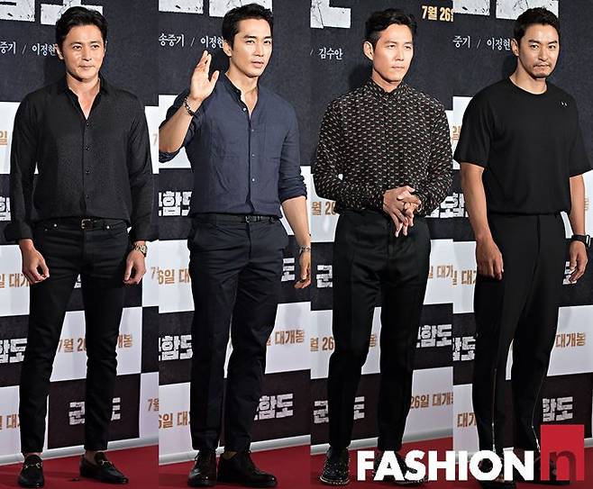 장동건과 주진모는 군더더기 없는 깔끔한 올블랙 스타일링을 선보였다. 장동건은 블랙 셔츠와 팬츠에 골드 체인장식이 들어간 로퍼로 댄디한 무드를 자아냈다. 주진모는 블랙 반소매 티셔츠에 밑단에 지퍼 장식이 있는 독특한 슬랙스와 스트랩 슬리퍼를 매치해 시크한 캐주얼룩을 완성했다. 여기에 수염까지 더해져 부드러운 카리스마 기운도 함께 느낄 수 있었다.