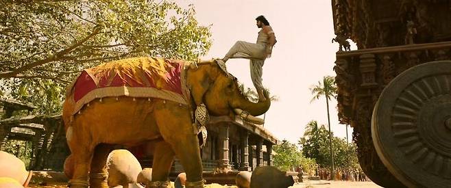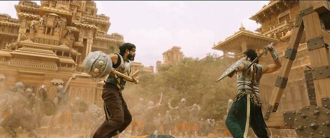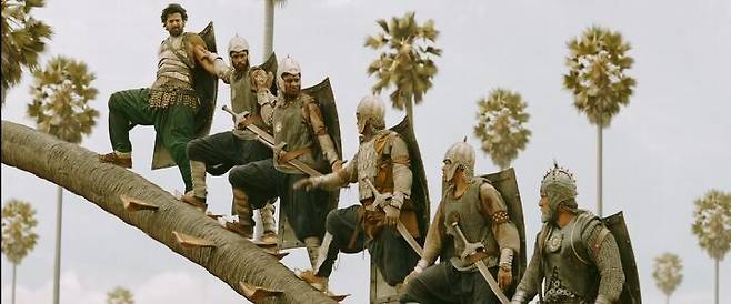 바후발리는 슈퍼히어로 같은 존재입니다. 돌진하는 코끼리를 제압한다든가 상상하지 못한 방법으로 성벽을 뛰어넘는, 인간이라면 할 수 없는 일들을 해내죠. 이런 장면들은 인도 영화 특유의 과장된 몸짓과 사운드가 더해지면서 오글거림을 극대화시켜줍니다.
