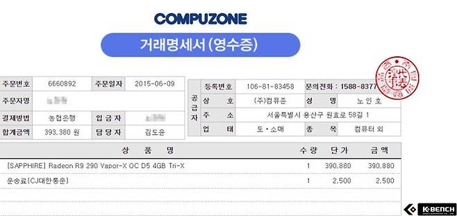 위 영수증처럼 2015년 6월 9일에 구입했던 그래픽카드의 경우 최대 2018년 6월 9일까지 무상 AS를 받아 볼 수 있다. 그렇기 때문에 중고로 그래픽카드를 구입하는 경우에는 영수증을 받을 수 있으면 반드시 챙겨야한다.