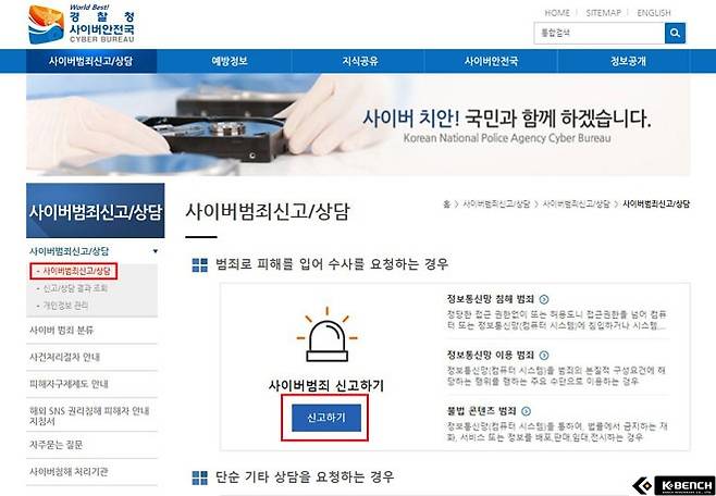 인터넷을 통한 사이버신고는 경찰청에서 운영중인 '사이버안전국' 홈페이지에서 가능하다. 상단 메인 메뉴에서 '사이버범죄/상담' 메뉴를 클릭하면 신고할 수 있는 화면으로 바로 넘어갈 수 있다.