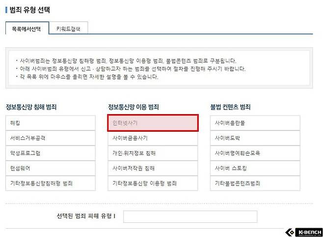 '신고하기' 버튼을 누르면 아이핀이나 휴대폰을 통해 본인인증을 진행하고 신고인 정보에 인저 사항을 기재한 후 범죄 유형을 '인터넷사기'로 선택하면 된다.