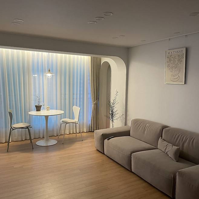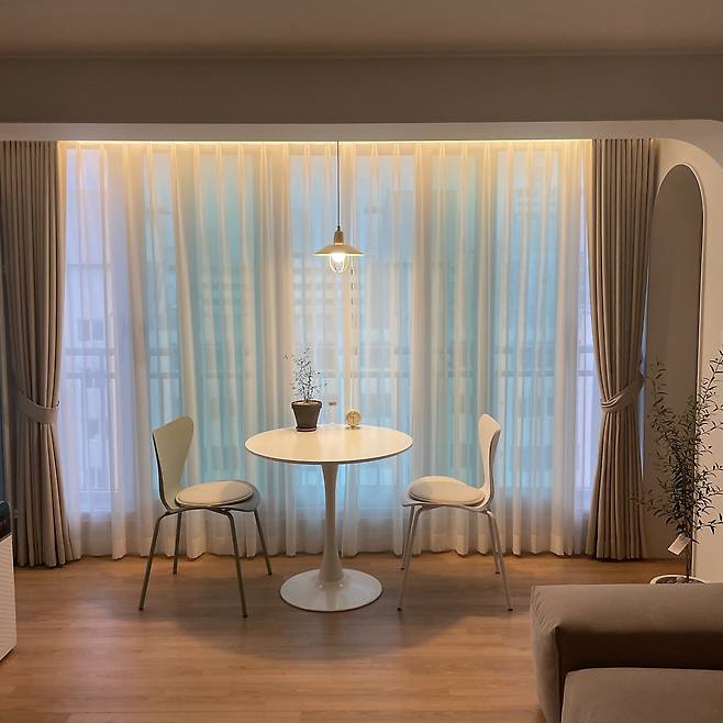 이번엔 거실의 BEFORE & AFTER예요. 거실은 가장 먼저 베란다 확장 공사부터 진행했는데요. 확장된 부분은 아치 모양으로 포인트를 주고, 테이블과 의자를 두어 다이닝 공간을 만들어 두었습니다. 부엌 쪽에 식탁을 둘 공간이 애매해서 식사는 이곳에서 하고 있답니다.
