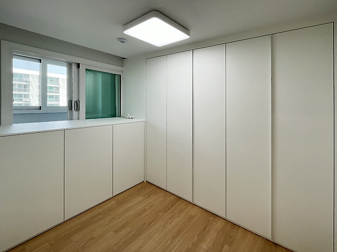 이 방에 어떻게 가구를 들일지 고민할 당시에는 우선 방의 한 면만 붙박이장으로 채우고 마무리를 지으려고 했는데, 마지막에 창문은 열고 닫는데만 문제가 없게끔 조금 낮은 장을 짜 넣었어요. 창문을 조금 가리긴 하지만, 안 만들었으면 정말 큰일 날 뻔했습니다. 이외에 남는 공간에는 전신거울 하나와 청소기를 두어, 작지만 알찬 드레스룸을 만들었습니다.
