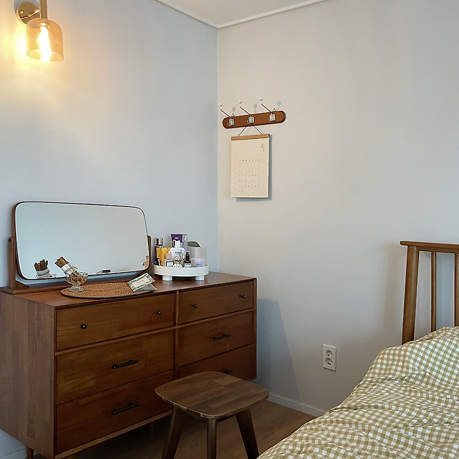 화장대를 할까 수납장에 거울을 올려서 화장대로 사용할까 고민했었는데, 결국 수납장을 선택했어요. 지금 와서 생각해 보면 정말 잘한 선택인 것 같아요. 침대, 협탁, 수납장, 거울 모두 원목가구지만 과하지 않고 너무 잘 어울려요.