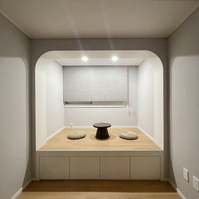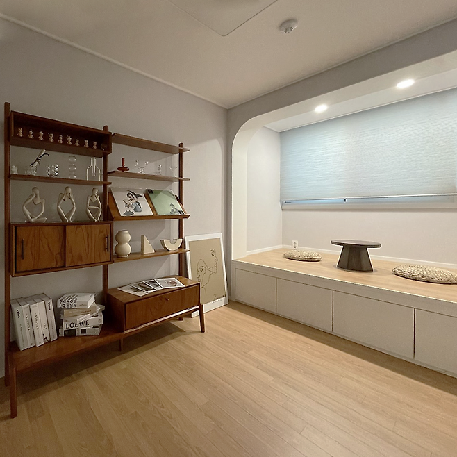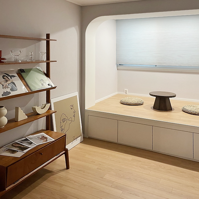 입구 쪽에 있는 방은 저의 서재 겸 취미방으로 만들려고 했어요. 이곳도 우선 베란다를 확장했고, 그 후에 공간 활용과 가구배치에 대해 엄청 고민을 했어요. 그러다 한 번쯤 해보고 싶었는데, 포기했었던 평상 인테리어를 여기에 하면 딱이겠다 싶은 거예요. 다행히 목공 공사 전이였기 때문에 가능했어요!