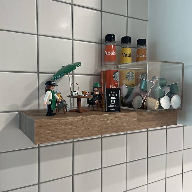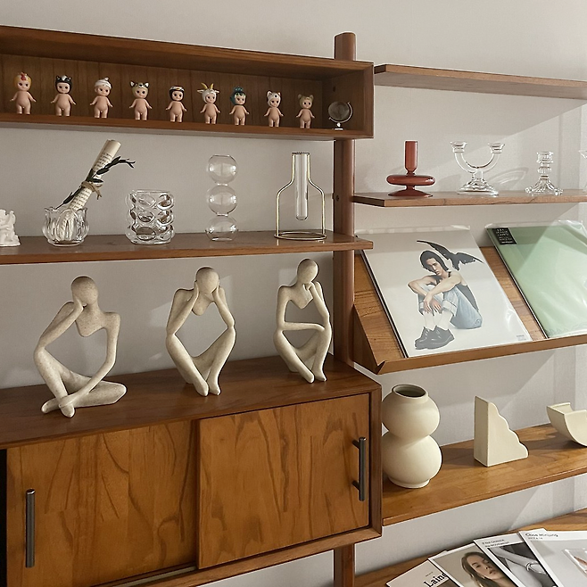 평상 옆에는 우드 선반을 두었는데요. 이곳에는 제가 그동안 모은 인테리어 소품들을 진열해두었습니다. 바라만 봐도 너무 예쁘고 배가 불러요.