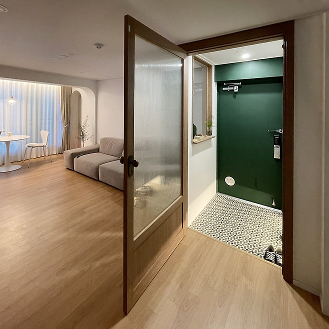 저희 집 현관 BEFORE와 AFTER 모습입니다. 원래는 벽 쪽에 신발장이 있고, 단차가 있는 전형적인 옛날 집 현관이었어요. 리모델링을 진행하면서 현관문은 짙은 초록색으로 페인팅하고, 창문이 뚫려 있는 가벽을 세워 우드 우드 한 중문까지 달아보았습니다. 바닥 타일의 무늬가 독특해서 그런지 전체적으로 빈티지한 느낌이 나는 현관으로 완성됐어요.