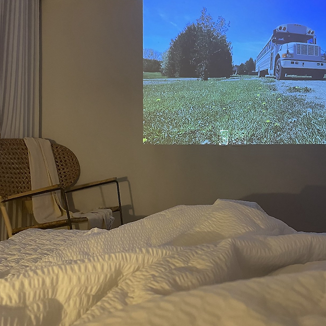 저녁에는 침대에 누워서 벽에 빔을 쏴서 보는데 너무 좋아요. 정말 침실은 제가 제일 좋아하는 공간이자, 제가 제일 많은 시간 생활하는 공간이랍니다.