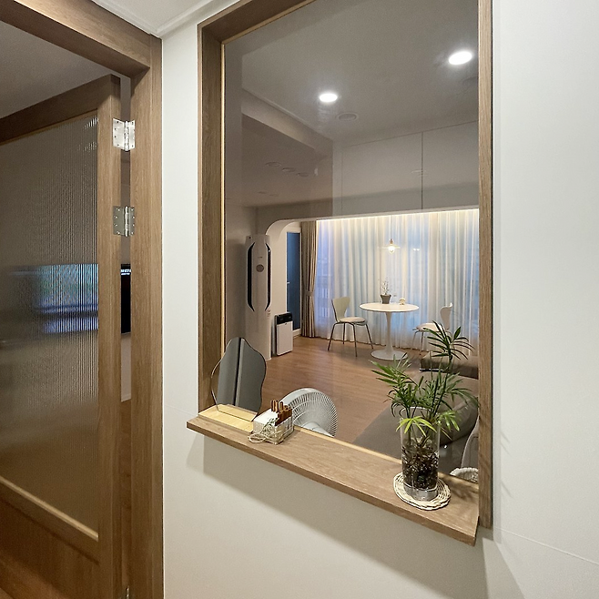 가벽에는 창문을 뚫어 거실 소파에 외출할 때 집안을 한번 쓱 둘러볼 수 있게 만들었습니다. 창문 아래쪽을 선반처럼 쓸 수 있게 만들어서 수경식물을 올려두었어요.