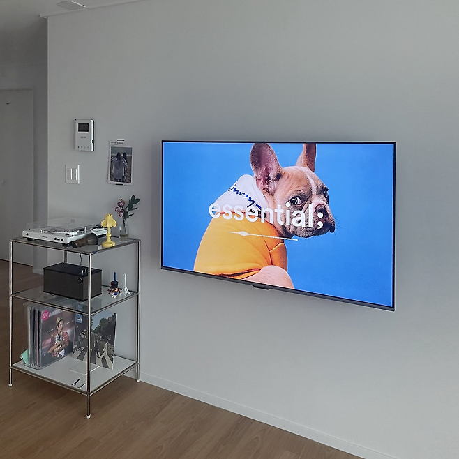거실을 꾸밀 때는 최대한 깔끔하고, 가전 가구들도 최소한의 제품만 두려고 했어요. 그래도 제가 제일 좋아하는 턴테이블을 두는 건 잊지 않았답니다. 집에 들어오자마자 음악을 틀 수 있게 TV 옆에 모듈 가구를 두어 턴테이블을 올려두었고, TV는 하부장 없이 벽걸이로 설치했습니다.
