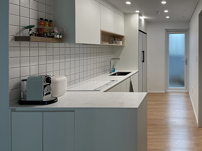냉장고가 생각보다 커서 주방을 조금 늘렸는데, 아무도 모를 만큼 티가 나지도 않고요. 사실 이것 때문에 바로 옆방 문틀이 그만큼 늘어났는데 사람들한테 말하면, 그제야 '아, 그래서 여기 문틀이 넓구나'하지 다들 모르겠다고 하더라고요. 그래서 너무 만족스럽습니다.