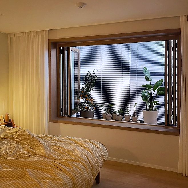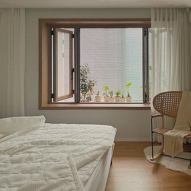 침실은 제가 딱 '이거 해야 한다' 생각해둔 인테리어가 있었고, 그걸 실현해 줄 수 있는 업체를 찾았었어요. 일단 침실은 확장을 하지 않았고, 폴딩도어를 만들고 싶었거든요. 그리고 살려둔 베란다 공간에는 화분을 키우고 싶었어요. 그 결과 이렇게 힐링 공간이 완성되었답니다. 액자 뷰 같은 느낌이지 않나요?
