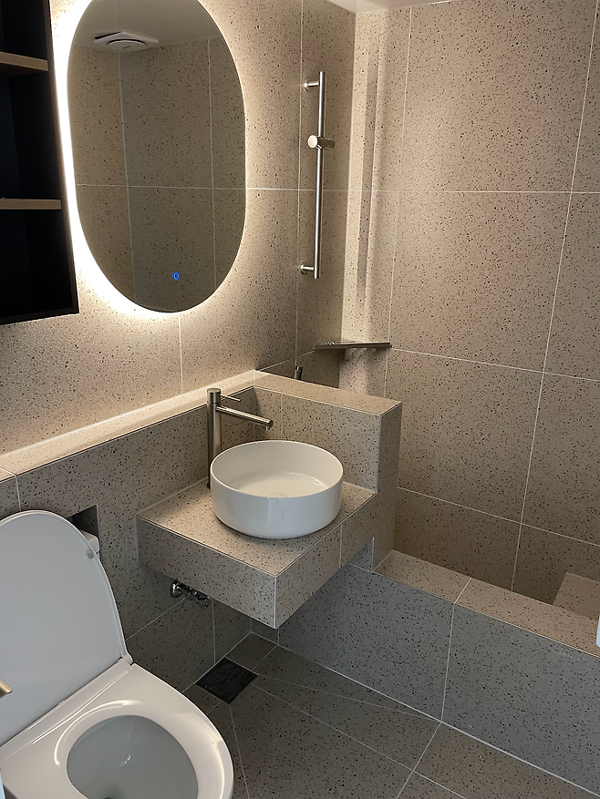 욕조 겸 샤워부스 느낌으로 이렇게 만들었고, 타일도 600각으로 과하지 않은 테라 저 느낌으로 선택했는데 정말 너무 마음에 들어요. 거울에 은은하게 조명이 들어오면 더 예쁘더라고요.