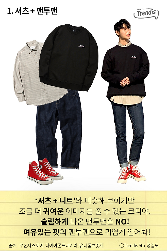 ‘셔츠 + 니트’와 비슷해 보이지만 조금 더 귀여운 이미지를 줄 수 있는 코디야. 슬림하게 나온 맨투맨은 NO! 여유있는 핏의 맨투맨으로 귀엽게 입어봐!