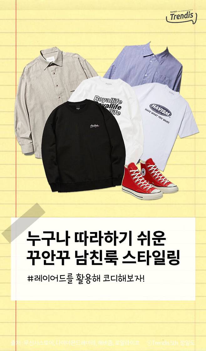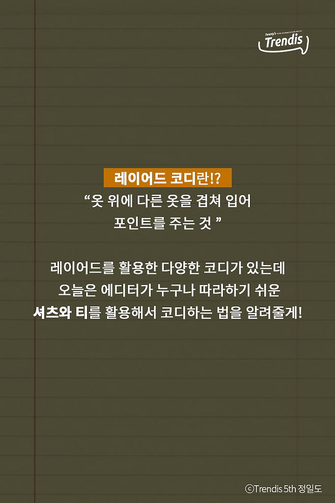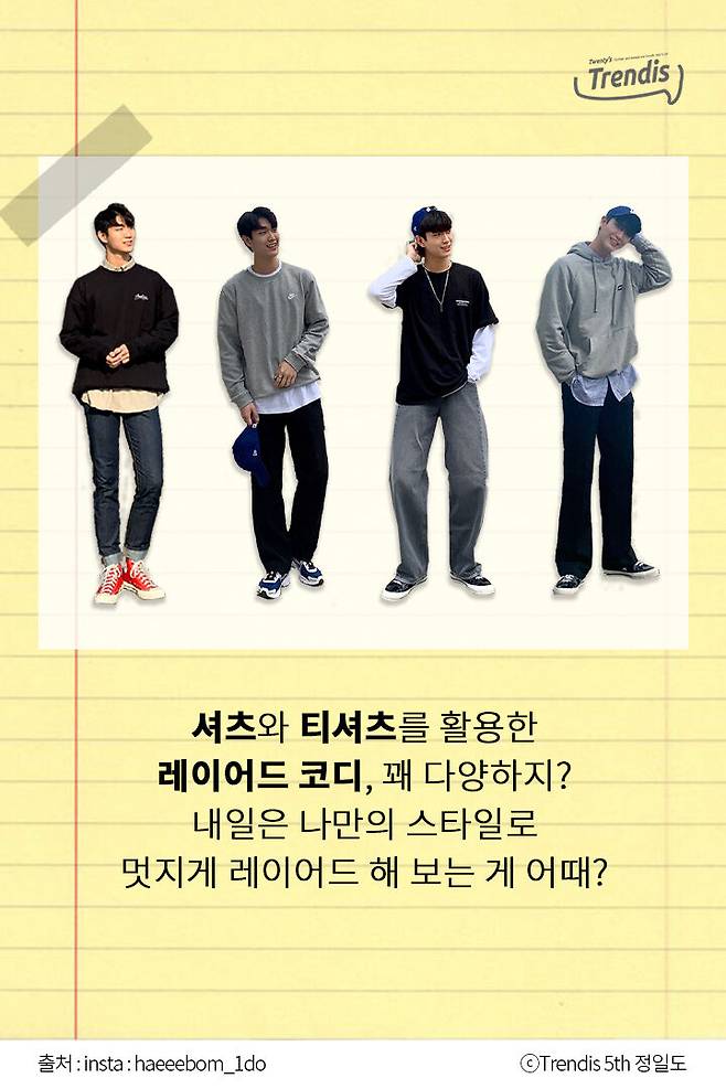 레이어드를 활용한 다양한 코디가 잇는데 오늘은 에디터가 누구나 따라하기 쉬운 셔츠와 티를 활용해서 코디하는 법을 알려줄게!