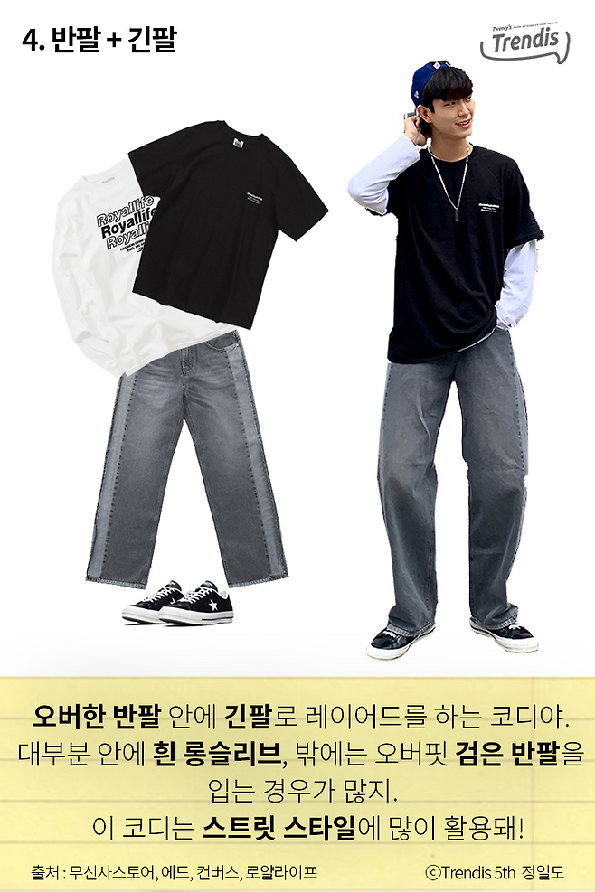 오버한 반팔 안에 긴팔로 레이어드를 하는 코디야. 대부분 안에 흰 롱슬리브, 밖에는 오버핏 검은 반팔을 입는 경우가 많지. 이 코디는 스트릿 스타일에 많이 활용돼!