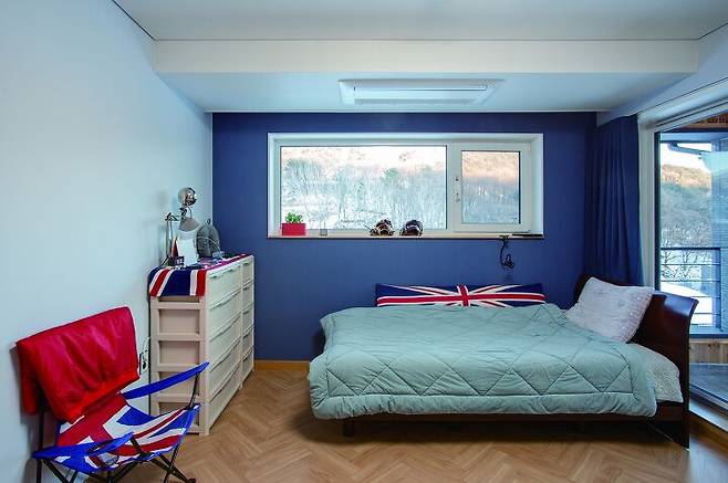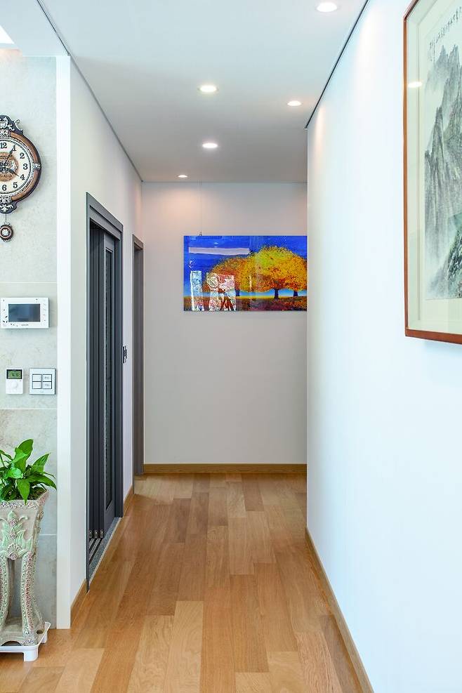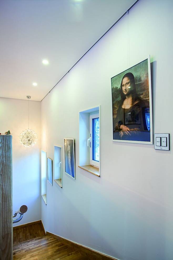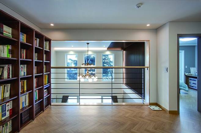 이 주택의 포인트 공간은 계단실이다. 변호사이자 회화에 조예가 깊은 딸이 직접 그린 그림과 관심 많은 작품을 모아 계단실을 갤러리처럼 꾸민 것이다. 계단 난간도 작은 소품을 장식하는 진열장으로 이용해 보는 재미로 넘친다. 계단을 오르면 또 다른 넓은 거실이 반긴다. 운동선수인 아들은 시즌 때만 찾고 별도 거주 공간이 있는 딸도 가끔 찾기 때문에 2층이 비어 있는 날이 많지만, 잠시 머무는 동안이라도 편안히 쉬도록 독립적인 공간을 만든 것이다. 또, 향후 자녀가 독립한 후엔 2층을 별도의 공간으로 사용할 생각도 있었다.