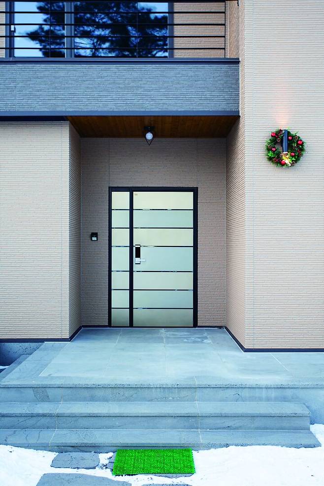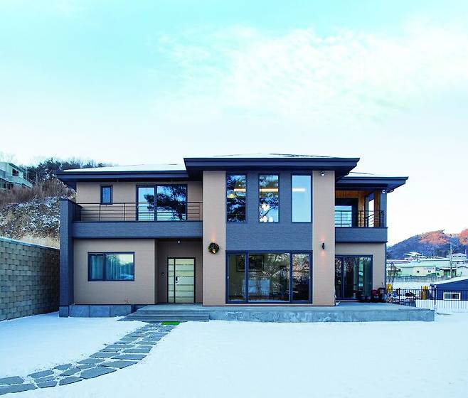 주택은 사각형 매스로 형태를 단순화했다. 재료는 석재 사이딩으로 통일감을 주고 브라운과 블랙 색을 조합해 변화를 줬다. 주택 정면은 집 안 가득 풍경을 끌어들이기 위해 설치한 통창과 상부의 세로 창이 재료 물성과 더해져 강렬한 인상을 준다. 침실과 식당 등 정면을 향한 곳에도 모두 넓은 창을 내 전체 인상은 풍경을 바라본다는 느낌이다.