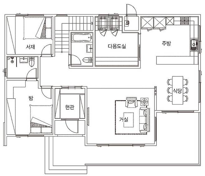 가족이 합을 이루지 못하거나 풀리지 않은 부분은 설계·시공사에 맡겼다. 설계 담당자는 수월하게 문제를 해결하고 건축주 부부와 함께 공간을 적절하게 나눴다. 먼저 세대를 수직으로 나눠 1층에 부모 2층을 자녀의 공간으로 설정했다. 1층은 현관에서 좌우로 동선을 나눠 오른쪽에 공유 공간, 왼쪽에 사적 공간인 안방과 서재를 배치했다. 공유 공간인 거실과 식당은 조망을 위해 정면에 두고 주방과 다용도실을 뒤쪽에 배치했는데, 각 공간은 제 역할에 충실하도록 사선 배치와 가벽을 통해 영역을 나눴다. 안방과 서재는 서로 밀접한 관계에 있어 서로 마주 보게 배치했다.