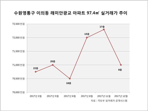 래미안광교는 지난해 5월까지 매달 1~2건씩 거래됐다가 수도권 집값이 들썩였던 6~9월에는 6~7건으로 크게 늘었다. 이후 ‘8·2부동산 대책’이 발표되면서 10월에 2건으로 거래량이 주춤했다가 11월부터 다시 거래가 살아나고 있다.