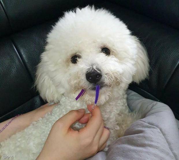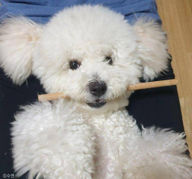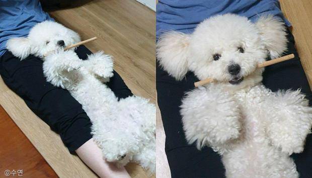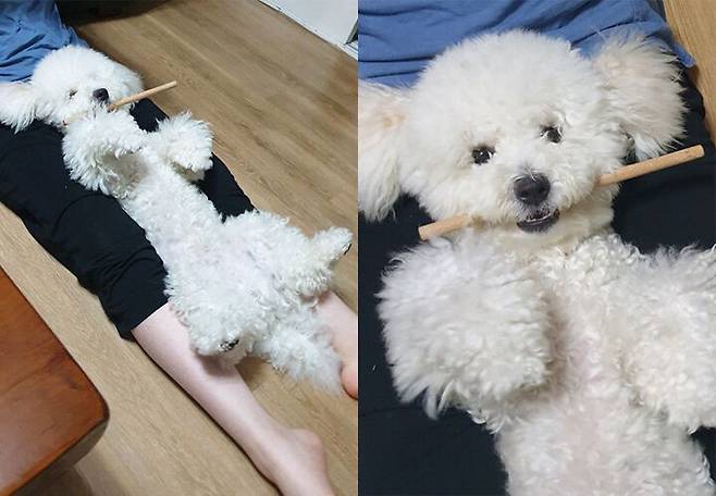 [수연 씨 : 소파 등받이를 밟고 올라가야 겨우 닿는 높은 곳에 둔 나무 막대기를 꺼내 물고 제 다리 사이에 얌전히 누워 있는 상태에서 귀까지 말괄량이 삐삐처럼 된 모습이 너무 장난꾸러기 같아 얼른 사진을 찍었답니다.]
