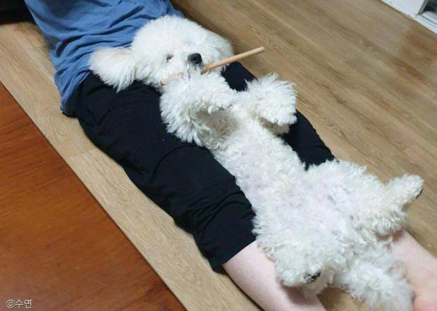 [노트펫] 주인의 다리 위에 자리를 잡고 누운 강아지는 아무런 근심 걱정 없이 신선놀음을 즐겼다.
