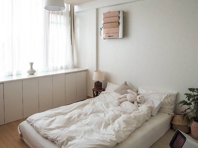 침구 : 이케아 DVALA 드발라 이불커버+베개커버 / 매트리스 : 이케아 JOMNA 옘나 스프링매트리스 / 러그 : 마켓비 NASRI 러그 150x200 /히터 : 플러스마이너스제로 리플렉트 에코 히터 REH-400 / 바스켓 : 마켓비 BELY 해초 바구니 / 액자 : ourstudio Henri Matisse Drawing Poster