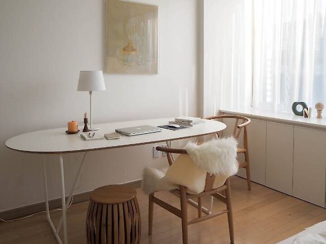 테이블 : 이케아 SLÄHULT 슬레훌트 테이블상판, BACKARYD 바카뤼드 하부프레임 / 의자 : 가구구가 Y 체어 / 커튼 : 동대문시장 / 러그 : 마켓비 YANGMO 장모러그 / 탁상스탠드 : 이케아 RODD 로드 탁상스탠드본체, 이케아 JARA 예라 전등갓 / 액자 : 오픈갤러리 / 라탄소품 : 빈티지제품
