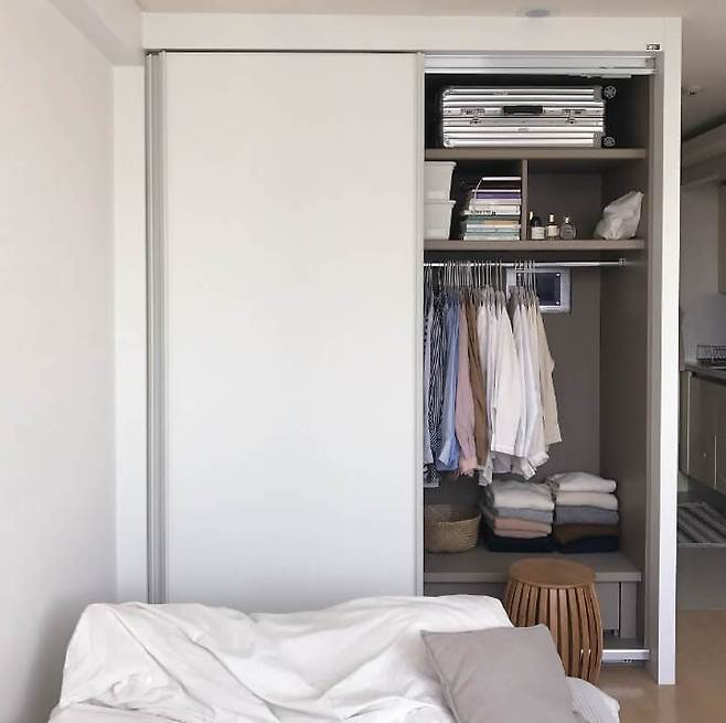 여자다 보니 옷이 많은 편이어서 한 달간 고민을 하다가 침대 옆 공간에 붙박이장을 설치했어요. 제 옷 사이즈와 여행 가방 사이즈에 맞춰서 맞춤으로 제작했어요. 집은 더 좁아졌지만 그만큼 수납이 엄청나게 많이 된다는 장점이 있어서 매우 만족해요.