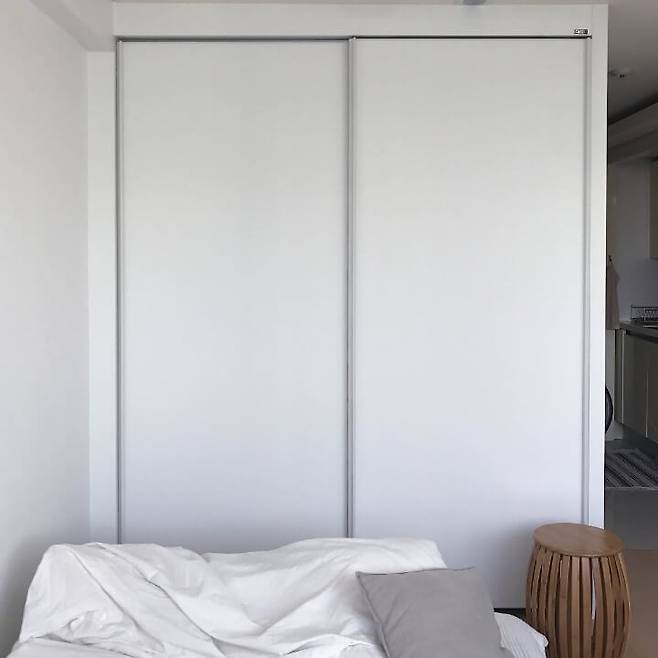 여자다 보니 옷이 많은 편이어서 한 달간 고민을 하다가 침대 옆 공간에 붙박이장을 설치했어요. 제 옷 사이즈와 여행 가방 사이즈에 맞춰서 맞춤으로 제작했어요. 집은 더 좁아졌지만 그만큼 수납이 엄청나게 많이 된다는 장점이 있어서 매우 만족해요.