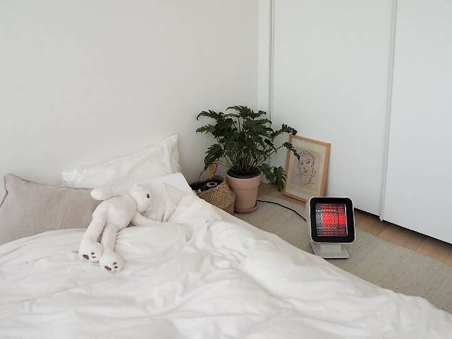 침구 : 이케아 DVALA 드발라 이불커버+베개커버 / 매트리스 : 이케아 JOMNA 옘나 스프링매트리스 / 러그 : 마켓비 NASRI 러그 150x200 /히터 : 플러스마이너스제로 리플렉트 에코 히터 REH-400 / 바스켓 : 마켓비 BELY 해초 바구니 / 액자 : ourstudio Henri Matisse Drawing Poster