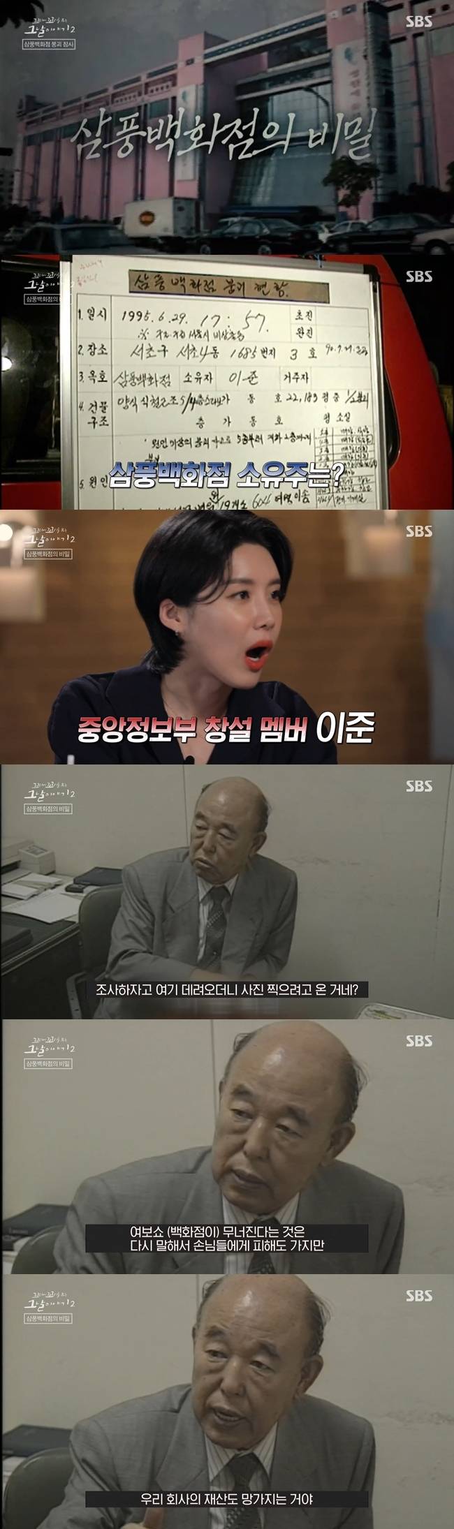 이날 장성규는 "삼풍백화점 소유주는 이준 회장"이라고 말했다. 이어 제시된 자료화면에는 붕괴 사고 당시 조사를 앞둔 이준 회장의 막말이 담겼다. 그는 "조사하자고 여기 데려오더니 사진 찍으려고 온 거네. 여보쇼. (백화점이) 무너진다는 것은 다시 말해서 손님들에게 피해도 가지만 우리 회사의 재산도 망가지는 거야. 알고 싶거든. 사장에게 물어보쇼"라고 무책임한 태도로 일관해 경악을 안겼다.