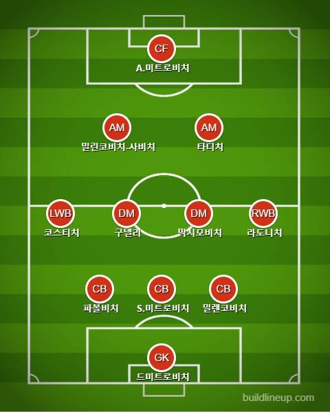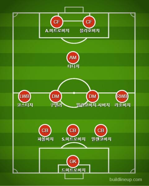 이 경기에서 세르비아는 3-4-2-1 포메이션을 들고 나왔다. 미트로비치와 두산 블라호비치가 투톱으로 나섰고, 에이스 두산 타디치가 공격형 미드필더에 포진해 공격 지원에 나섰다. 필립 코스티치와 다르코 라조비치가 좌우 측면을 책임졌고, 네마냐 구델리와 핵시 미드필더 세르게이 밀린코비치-사비치가 중원을 구축했다. 스테판 미트로비치를 중심으로 스트라히니야 파볼비치와 니콜라 밀렌코비치가 스리백을 형성했다. 골문은 마르코 드미트로비치 골키퍼가 지켰다.