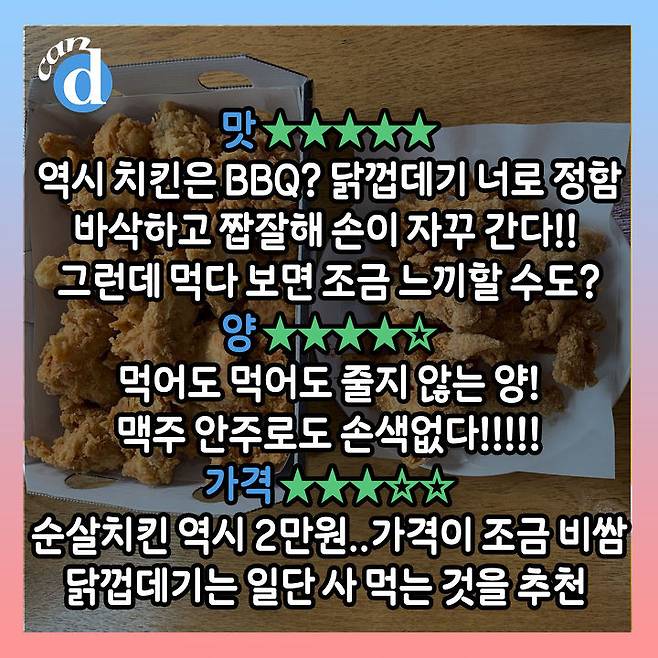'황금올리브 순살'과 'BBQ 닭껍데기'를 맛보게 되었습니다.