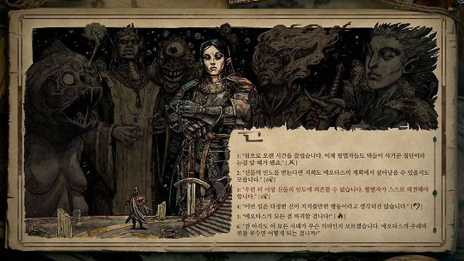 동료 숫자가 줄은 대신, 동료와의 리액션은 좀 더 많아졌습니다. 우선 각 동료별로 어떤 것을 좋아하고 싫어하는지가 표시되어, 이에 맞춰서 행동해야 친밀도가 높아집니다. 예를 들어 초반 동료인 에데어는 동물을 좋아하지만 올란에 대해서는 부정적인 견해를 갖고 있으며, 에오타스로 인해 큰 피해를 본 과거가 있는 만큼 광신도들을 싫어합니다. 알로스의 경우에는 전작에서 심혼술사들에게 크게 데인 경력을 갖고 있었던 만큼, 심혼술을 싫어하기도 하죠.