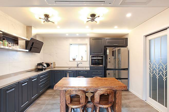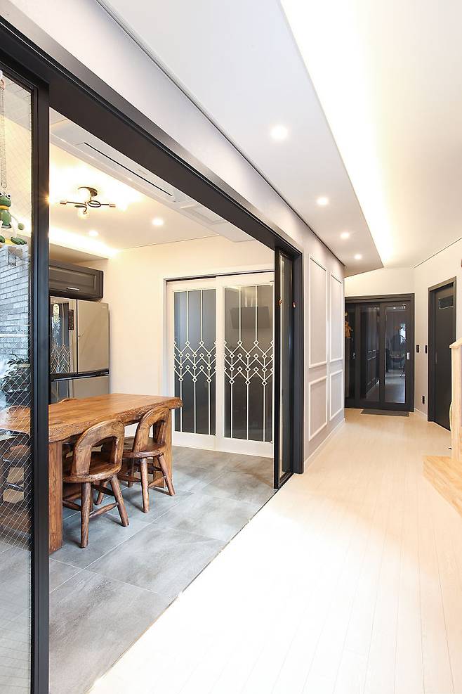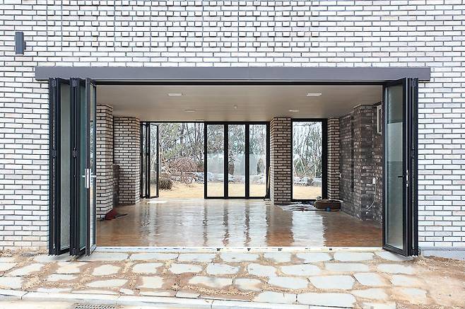 건축주도 이러한 목적으로 실내 차고를 계획했다. 그래서 차를 2대 주차하고도 공간이 넉넉하도록 차고를 확보했다. 차고 전면엔 불투명 폴딩 도어를 설치해 시선을 차단하고 뒤쪽엔 투명 폴딩 도어를 설치해 마당과 연결했다. 날씨가 궂은 날에 양쪽 폴딩 도어를 모두 열면 차고는 바비큐 공간으로도 손색이 없다. 건축주는 ‘아직 차고를 다른 용도로 사용할 시간이 없었지만, 여유를 두고 조금씩 준비하고 있다”고 한다.