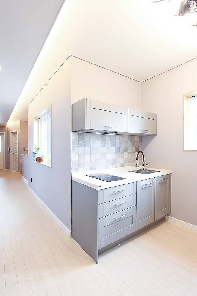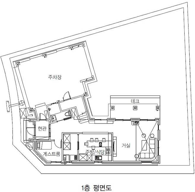 현관은 차고와 연결해 편리한 동선을 확보하고, 실외와 실내 사이에서 완충 공간으로 기능하도록 중문을 설치했다. 좌우로 인접 배치한 주방/식당과 거실은 고유의 독립 기능을 강조해 내벽으로 분리했다. 덕분에 조망이 좋은 거실은 음식 냄새와 생활 소음이 나지 않는 한결 쾌적한 공간이 됐다. 거실 전면은 필로티 구조로 폴딩 도어를 설치해 온실 역할과 함께 실내 냉난방 효율을 높이는 외피 효과를 냈다.