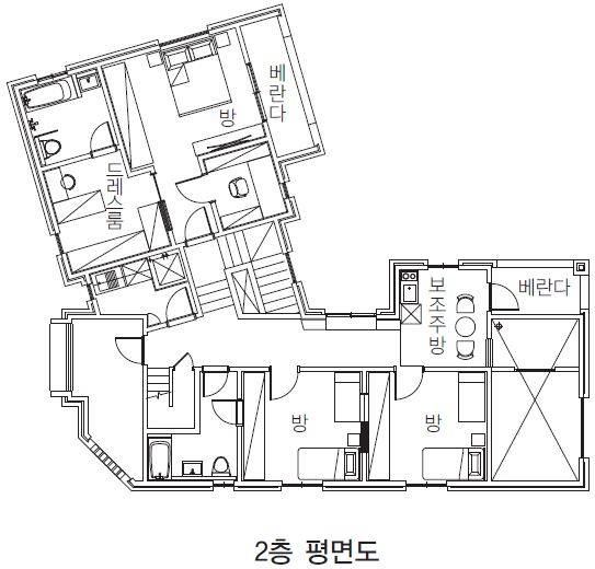 안방은 자녀 공간과 스킵 플로어 방식으로 위계를 주고, 전면에 서재와 드레스룸을 배치함으로써 프라이버시를 확보했다. 나란히 배치한 두 자녀의 침실은 복도뿐만 아니라 두 공간 사이의 내벽에서도 통하는 문을 냈다. 또, 방 하나는 복도 외 내부에서 화장실로 통한다. 향후 자녀들이 출가할 경우 필요에 따라 2개의 공간을 하나로 연계해 사용하도록 한 것이다.