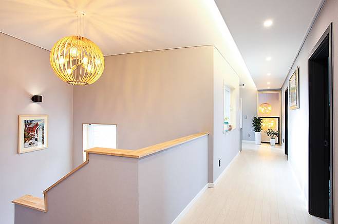 이 주택은 부부의 합작품이라고 할 수 있다. 남편은 가족 구성원의 생활 방식을 고려한 공간 배치와 중후한 입면을, 아내는 부드러운 느낌의 실내 디자인을 맡았다. 특히, 아내의 손길이 닿은 거실 분위기를 띄워주는 우드 메인 조명부터 공간에 활기를 불어넣는 포인트 화병, 귀여운 벽시계, 액자, 심지어 평범한 전기 스위치에 더한 귀여운 소품으로 시선을 머물게 한다. 이렇게 소소한 즐거움으로 가득한 이 주택은 ‘겨울’이라는 생후 3개월 시베리안 허스키를 입양하면서 다섯 식구의 꿈을 이어가는 공간이 됐다.