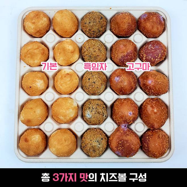 총 25개의 치즈볼이 들어있으며 맛 종류는 기본, 흑임자, 고구마 3가지로 구성되어있어요. 흑임자 원가가 가장 비싼건지 흑임자 개수만 5개에요.