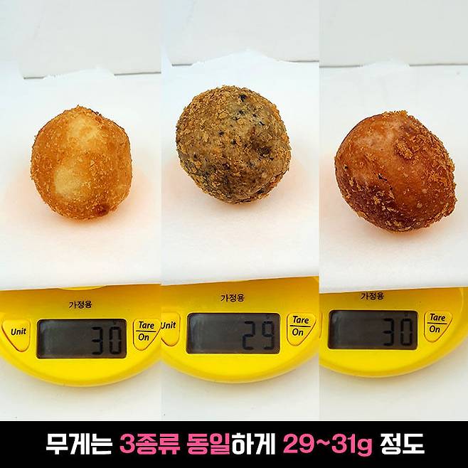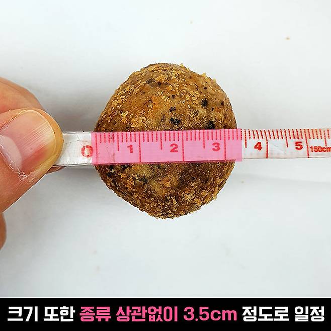 크기는 육안으로 보았을때도 거의 동일해보여 한개만 재보았어요. 결과는 3.5cm정도로 BHC 치즈볼 보다는 작은 크기였어요.
