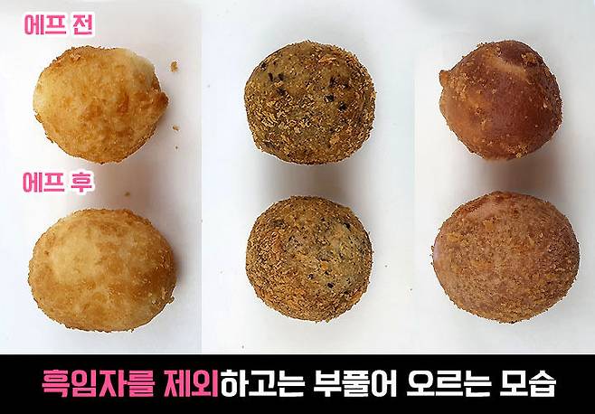 에프에 돌리고나니 흑임자 치즈볼을 제외하고는 부풀어 오른 모습이었어요. 반죽도 흑임자가 가장 빵에 가까운 느낌이었는데 그래서 그런걸까요?