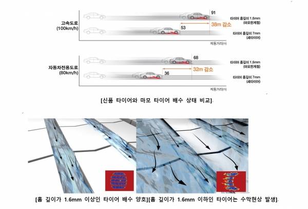 더욱이 시속 80km속도의 코너링 실험에서는 마모 정도가 거의 없는 타이어는 2~3m가량 미끄러지는 데 반해,마모 정도가 심한 타이어는 도로 밖으로 이탈하는 등 위험성이 극명하게 드러났다.
