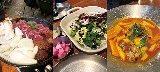 고기가 당길 때 우린 불 판 위에 지글지글 구워 먹는 숯불 고기 혹은 근사하고 포멀한 레스토랑의 스테이크를 떠올린다. 냄새가 배는 고깃집 말고, 부담스럽고 딱딱하지 않은 분위기를 원한다면 이곳을 찾으면 된다. 깔끔하고 아늑한 분위기의 매장, 미국산 프라임 등급의 고품질의 스테이크를 먹을 수 있는 곳이다. 400g의 푸짐한 소고기를 3만5000원의 가격으로 먹을 수 있다는 가성비 또한 솔깃하다. 겉면만 바삭하게 살짝 초벌로 구워 서빙이 되는데, 이후부터는 각 테이블 위에 있는 팬에서 자신이 원하는 굽기로 먹을 수 있다. 식사를 마칠 때까지 고기를 따뜻하게 먹을 수도 있다는 점, 스스로 원하는 굽기를 조절할 수 있다는 점, 버섯과 양파를 넉넉하게 함께 구워 먹을 수 있다는 점까지 아주 만족스럽다. 두툼한 덩어리 고기들이 보기에도 먹음직스럽지만, 입안에서 퍼지는 육즙과 부드러운 식감은 어지간한 스테이크 마니아 모두를 만족시킬 맛과 풍미다. 세트 메뉴 주문 시 샐러드, 바지락 떡볶이, 선택 메뉴(니꾸우동, 야끼카레, 명란파스타) 중 택 1이 가능하다. 스테이크는 200g씩(1만6000원) 추가 주문이 가능해 대식가도 부담 없이 맛있게 먹을 수 있다. 2~3만 원대의 와인리스트도 있다.