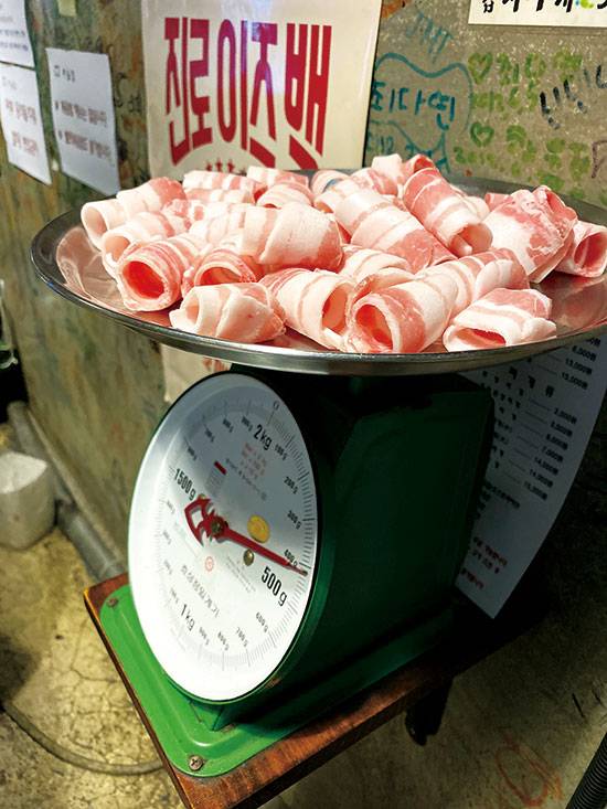 신분당선 성복역 근처에 위치한 저울집. 대형 ‘저울’이 식당 입구에 놓여있어 멀리서도 쉽게 발견할 수 있다. 드럼통과 스테인레스 쟁반으로 이뤄진 포차 분위기의 식당으로 대패삼겹살(1인분 9000원)과 차돌박이(1인분 1만2000원)를 메인 메뉴로 하는 고깃집이다. 주문과 함께 각 테이블 옆에 비치된 저울에 달아 서빙해준다. 고기도 물론 좋지만 저울집의 인기 비결은 바로 김치에 있다. 정성 들여 익힌 김치는 2년산 묵은지로 한입 베어 물면 눈이 감겨질 만큼 새콤하지만, 아삭한 식감을 그대로 간직했다. 삼겹살 기름에 노릇하게 구워 먹으면 별미. 콩나물과 양념 파절임도 불판에 볶아 곁들여 먹어 보자. 이 맛있는 모든 반찬이 2회까지만 제공되고 3회부터 3000원의 추가요금을 받는다. 비빔국수(7000원)를 시켜 바짝 구운 삼겹살에 말아먹는 것도 팁. 이 밖에 계란찜(7000원), 차돌 된장찌개(1만4000원), 번데기탕(1만 원) 등 술안주도 있다.